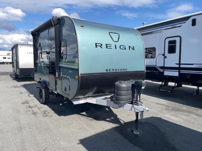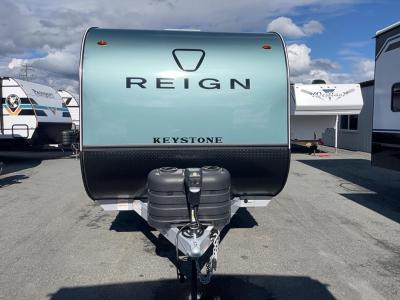 The Reign travel trailers by Keystone are premium single-axle units that are sure to make an impression at the campground. Each one is built with an exclusive automotive-finished aluminum exterior, a walkable roof, and a 100% composite floor for added durability. There are also tinted safety glass windows, quick drop stabilizer jacks, and an exterior shower with hot and cold water. The European inspired interior design is unique and cozy, and the 78" interior height will give you plenty of space to move about. You will also enjoy the ultra bright LED light strip and solid surface countertops in the kitchen, along with blackout night shades, and many more interior comforts.