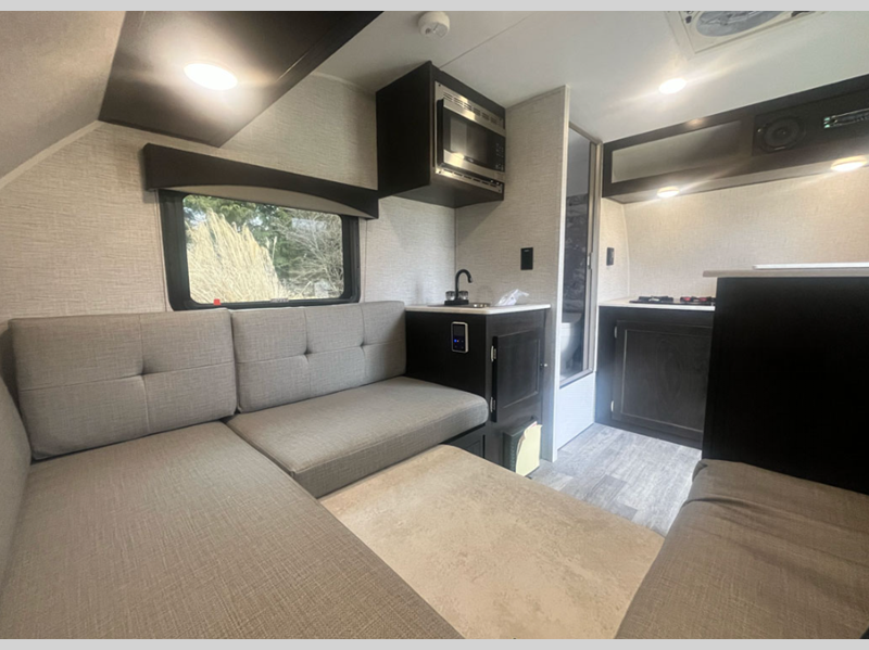- Exterior kitchenette with microwave, 12V refrigerator and Blackstone Griddle (10LT, 12LT only)